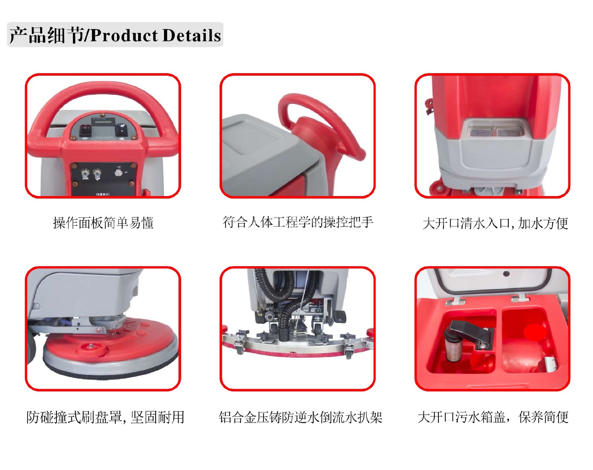 品牌洗地机操作面板简单易懂,符合人体工程学的操控把手,铝合金压铸防逆水倒流水扒架。大开口清水入口,加水方便,大开口式污水箱设计,保养简便。洗地设备双注水口加水设计,地面清洁设备可满足不同场所使用。按键式操作面板,简单易学。