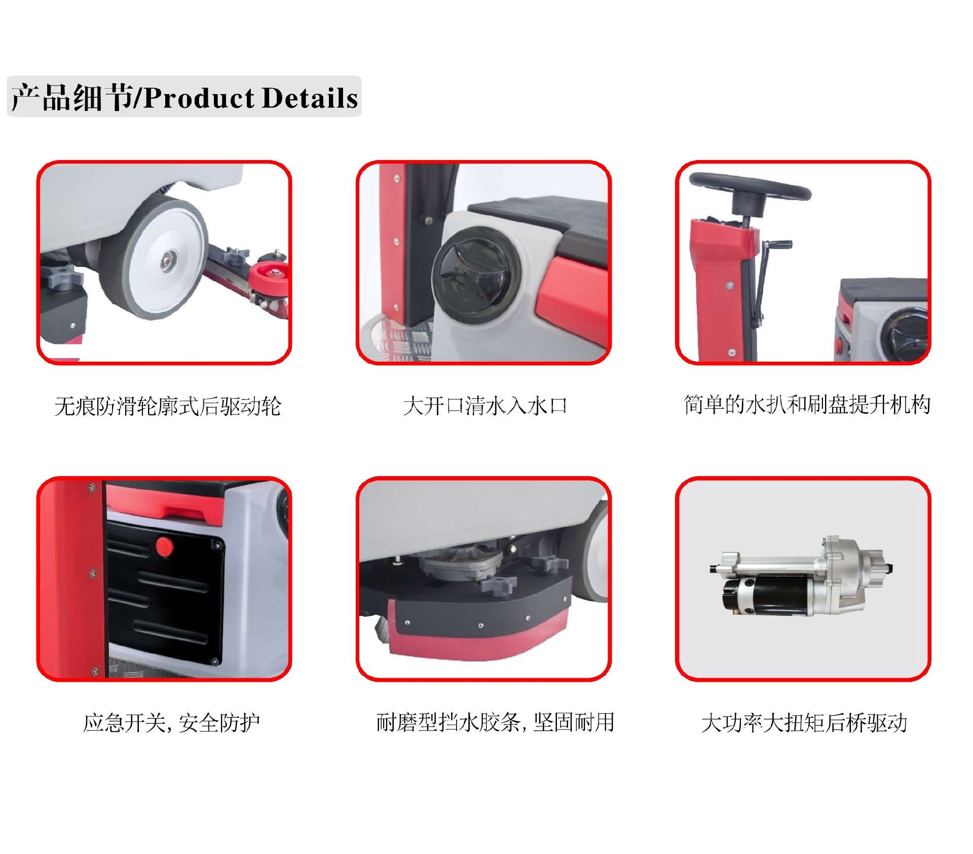 洗地设备故障检测和报警功能,让维护更简单。简单的水扒和刷盘提升机构,水扒提升后,整车倒车设计,有效保护水扒长时间使用。大扭矩驱动设计,转弯半径小,爬坡能力强,适合于不同的工作场所。
